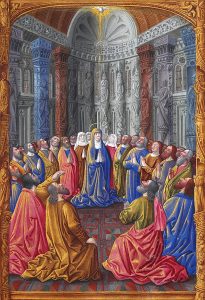 先ほどは、この日は「教会の誕生日」だと言いましたが、それは、本日の第一の朗読(使徒言行録2章1節以下)にありますように、聖霊降臨の出来事と教会の営みとが深く関わっているからです。確かに、それ以前にも弟子たちの集まりはありました。そういう意味では、教会の原型はすでにそこにあったのかも知れません。しかし、約束の通り、聖霊が降ってきてくださり、弟子たちの上に、私たちの上に留まってくださったことにより、大胆にイエス・キリストを証する宣教が始まっていったのです。これが、教会の姿。だからこその、教会の誕生日。